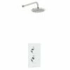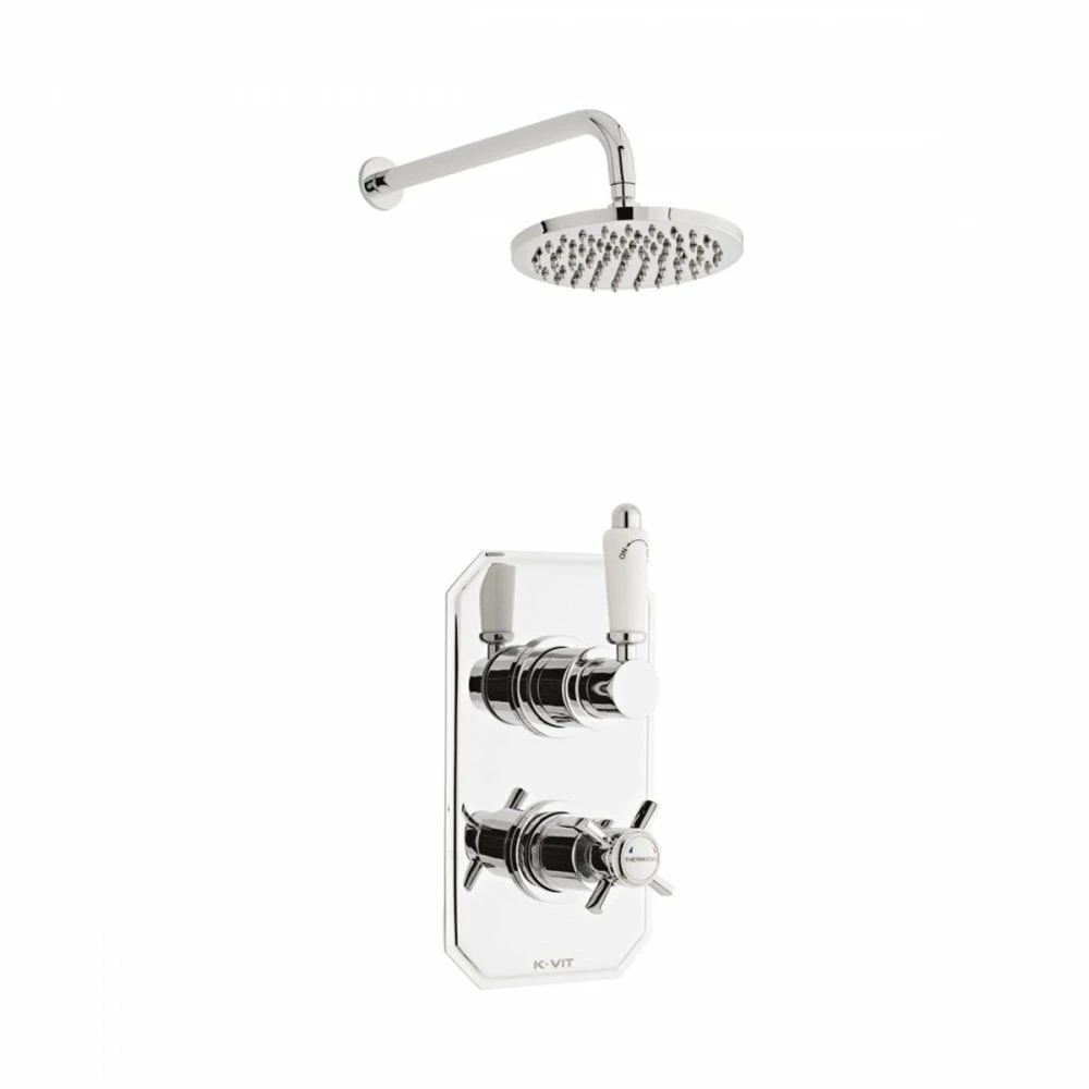 The Klassique range of showers and brassware by Kartell is a traditionally styled collection of chrome and white showers and bathroom accessories featuring curved and angular edges with white handles and details and a smooth finish to give the look of good taste and affluence in your modern bathroom. This concealed thermostatic shower valve features two control handles fitted on a chrome wall mounted back plate, the top handle features a smooth white grip and can be turned left or right to turn on the water flow, the chrome cross head handle below is used to adjust temperature and features a labelled white face. This set also includes an overhead fixed drencher shower head which connects to the concealed shower valve via hidden pipe work. The large rain style drencher shower head provides a heavy water flow and a luxurious showering experience.