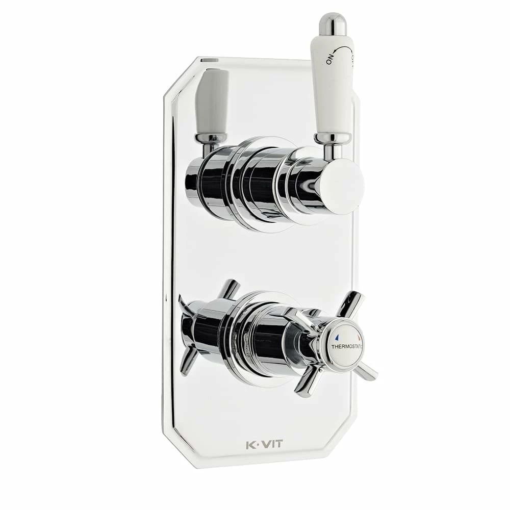 The Klassique range of showers and accessories by Kartell is inspired by traditional, elegant design yet intertwines subtle contemporary hints, featuring soft curves and white accents to give your bathroom an air of affluence. This concealed thermostatic shower valve has a four-spoke temperature control handle, labelled hot and cold. Above that is a luxurious handle with a smooth white grip, used to control water flow.