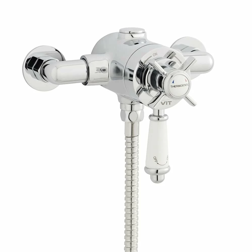 The Klassique range of showers and accessories by Kartell is inspired by traditional, elegant design yet intertwines subtle contemporary hints, featuring soft curves and white accents to give your bathroom an air of affluence. This exposed thermostatic shower valve can be paired with a traditional riser rail with shower handset, including matching sets from the Klassique range. The temperature is controlled by a luxurious labelled cross-head handle and water flow can be turned on or off by the large, smooth, white handle underneath.