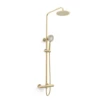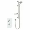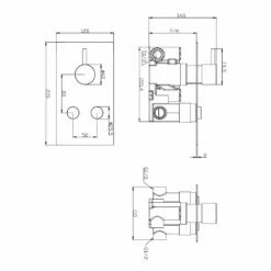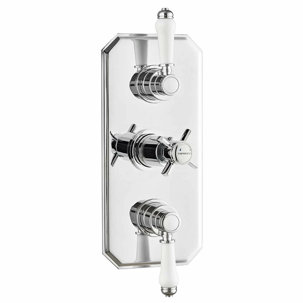 The Klassique range of showers and accessories by Kartell is inspired by traditional, elegant design yet intertwines subtle contemporary hints, featuring soft curves and white accents to give your bathroom an air of affluence. This triple concealed thermostatic shower valve with 2 way diverter has a four-spoke centre temperature control handle, labelled hot and cold. above and below that are two luxurious handles with white grips, used to control water flow and outlet.