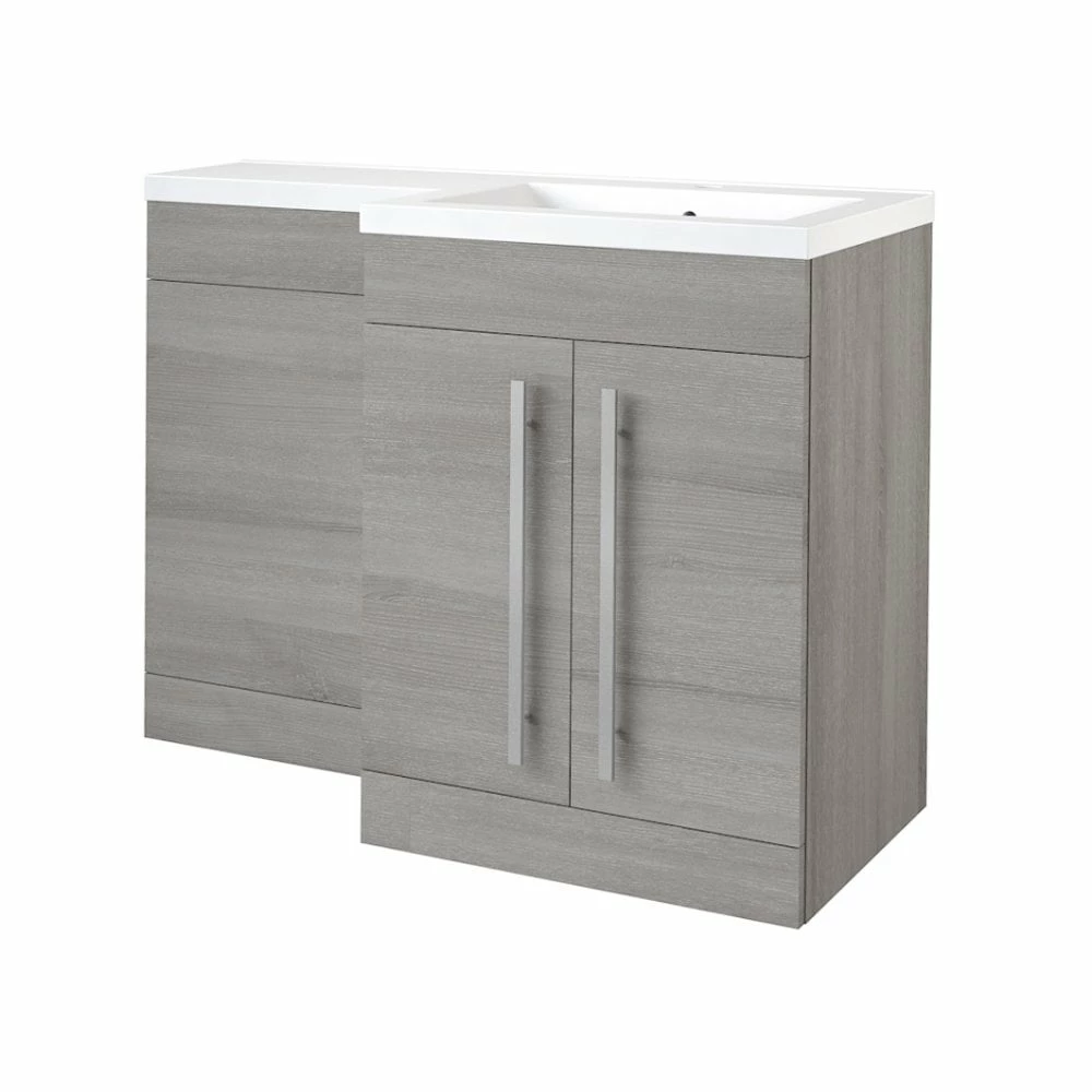 Upgrade your bathroom with the sleek and sophisticated Matrix 1100mm Right Hand L Shaped Combination Basin WC Unit. This modern set by Kartell features squared edges and no unnecessary fuss for a sharp, minimalistic look; not to mention exceptional durability. The solid build quality, soft close doors and large storage space make it perfect for busy bathrooms and combines style and functionality at unbeatable value. The large ceramic L-shaped basin and worktop sit flush onto the matching vanity unit & WC unit which are designed to sit directly side by side. Impress your guests with this modern addition to your bathroom!