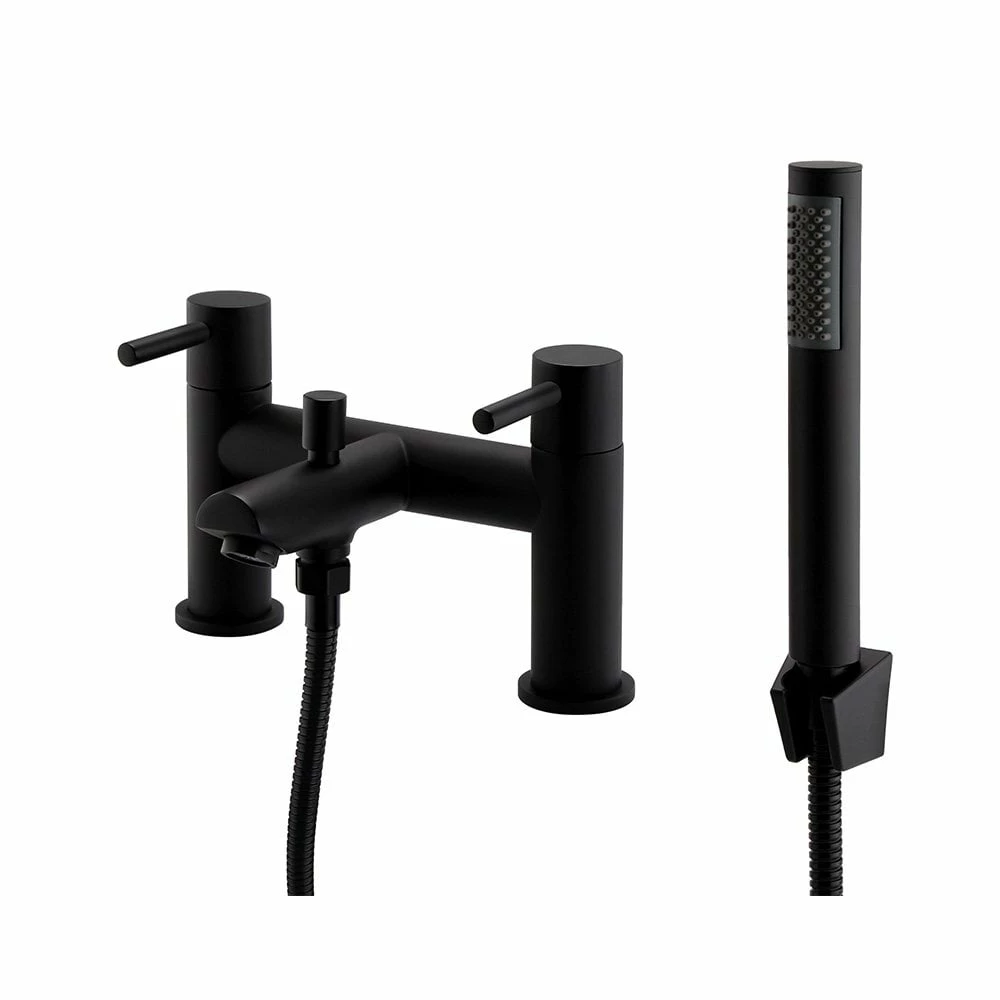 The Kartell Nero Round range of brassware is a contemporary collection of all black bathroom taps and accessories featuring smooth curves and a matt finish. This Bath Shower Mixer features a long tubular handset connected to the spout of the bath filler, operated by the two turning handles on the pillars of the bath filler. Backed by a lifetime guarantee and suitable for all plumbing systems. Waste not included.
