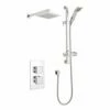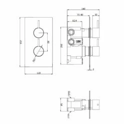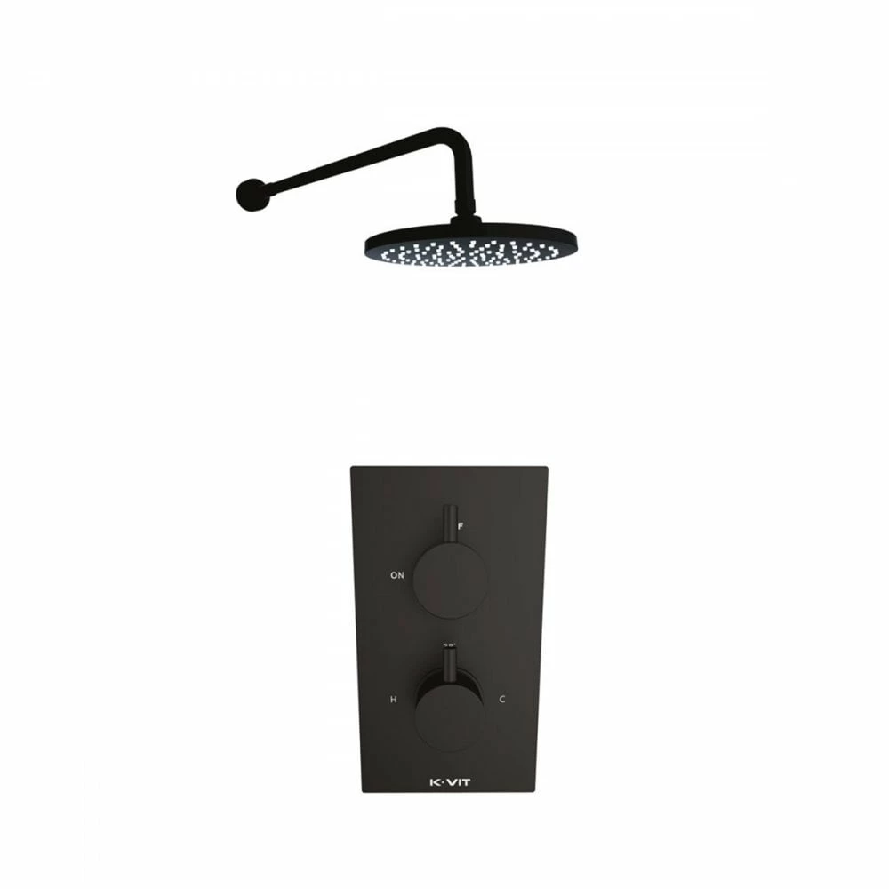 The Nero round range of showers and brassware by Kartell is a contemporary collection of all black showers and bathroom accessories featuring round edges and a matt finish to make a sophisticated but bold statement in your modern bathroom. This round concealed thermostatic shower valve features two separate control handles fitted onto a secure back plate which allow you to adjust water temperature and water flow whilst also keeping your bathroom looking super smart by hiding all pipework. This set also includes a round overhead fixed drencher shower head which connects to the concealed shower valve via hidden pipe work. The large rain style drencher shower head provides a heavy water flow and a luxurious showering experience.