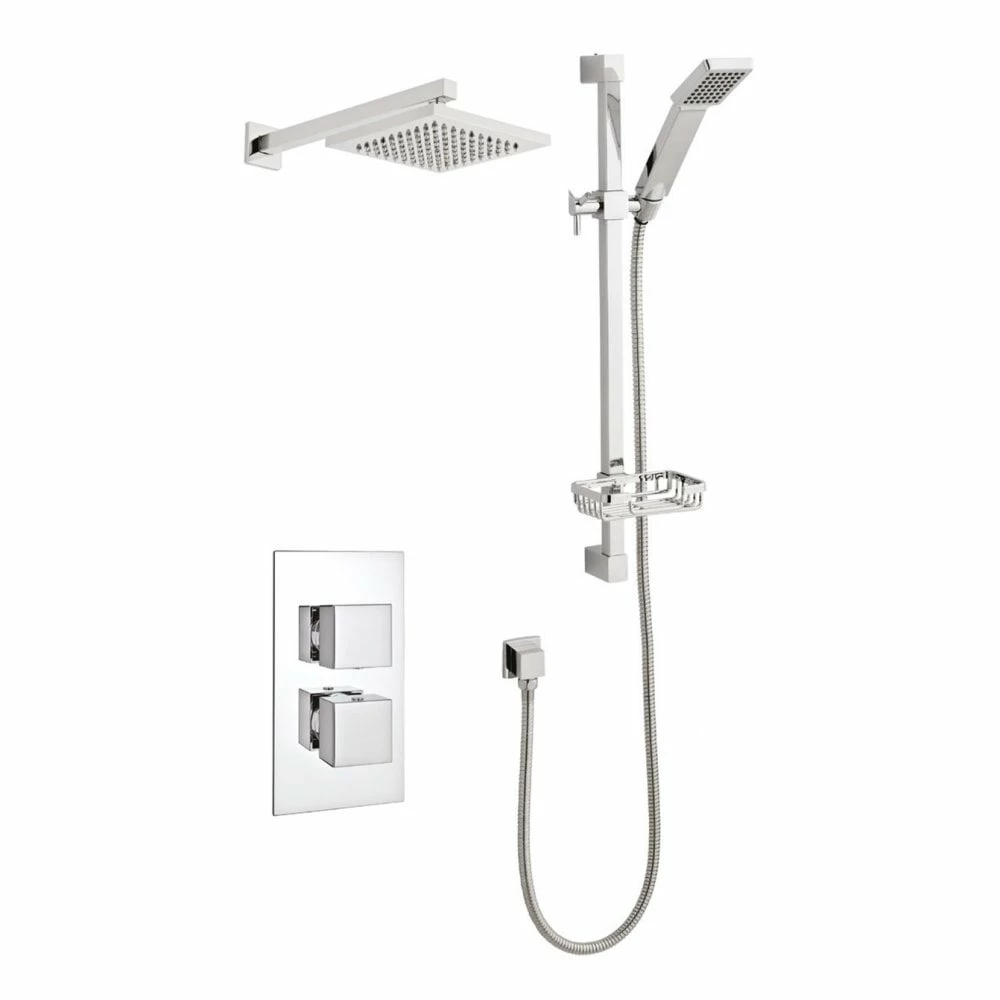 Pure Square Chrome Concealed Thermostatic Shower Valve, Adjustable Slide Rail Kit & Fixed Drencher Head