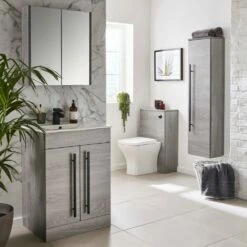 Upgrade your bathroom with the sleek and sophisticated Purity 500mm Floor Standing Double Door Unit in Silver Oak & 1-tap-hole Mid-Depth Ceramic Basin. This modern set by Kartell features squared edges for a sharp look, smooth brushed aluminium handles, and exceptional durability. The soft-close door mechanism and ample storage space make it perfect for busy families and paired with it’s compatible 1-tap-hole ceramic basin, it effortlessly combines style and functionality at unbeatable value. Impress your guests with this modern addition to your bathroom!