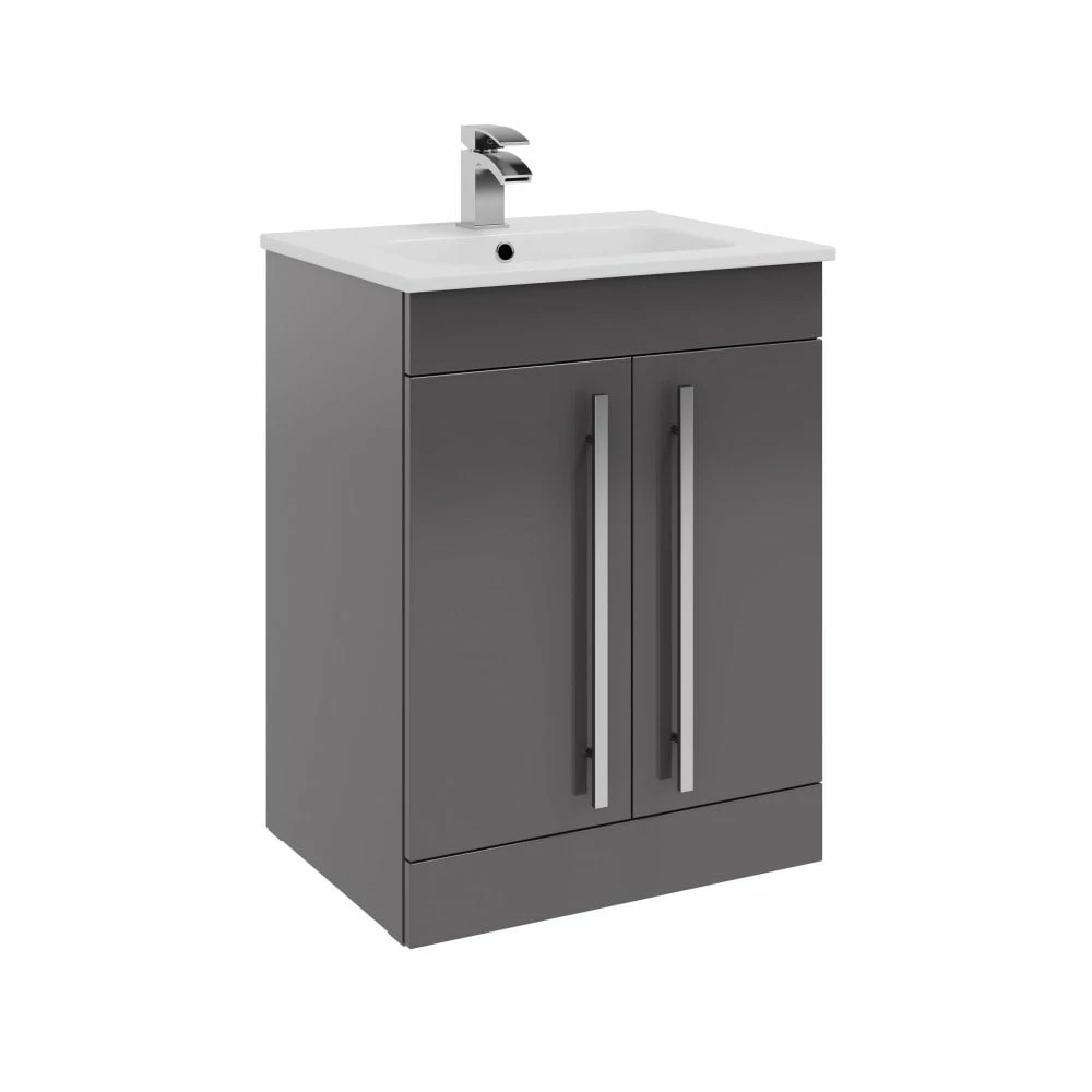 Upgrade your bathroom with the sleek and sophisticated Purity 600mm Floor Standing Double Door Unit in Grey Gloss & 1-tap-hole Ceramic Basin. This modern set by Kartell features squared edges for a sharp look, smooth brushed aluminium handles, and exceptional durability. The soft-close door mechanism and ample storage space make it perfect for busy families and paired with it’s compatible 1-tap-hole ceramic basin, it effortlessly combines style and functionality at unbeatable value. Impress your guests with this modern addition to your bathroom!