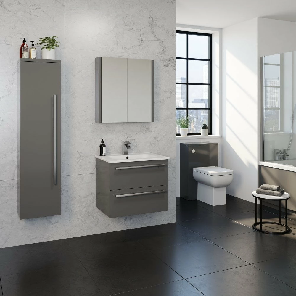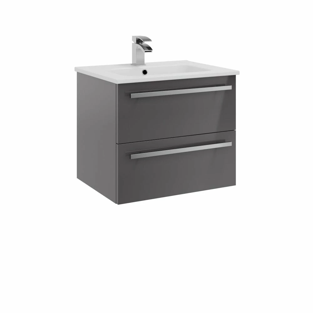 Upgrade your bathroom with the sleek and sophisticated Purity 600mm Wall Mounted Double Drawer Unit in Grey Gloss & 1-tap-hole Ceramic Basin. This modern set by Kartell features squared edges for a sharp look, smooth brushed aluminium handles, and exceptional durability. The soft-close drawer mechanism and ample storage space make it perfect for busy families and paired with it’s compatible 1-tap-hole ceramic basin, it effortlessly combines style and functionality at unbeatable value. Impress your guests with this modern addition to your bathroom!