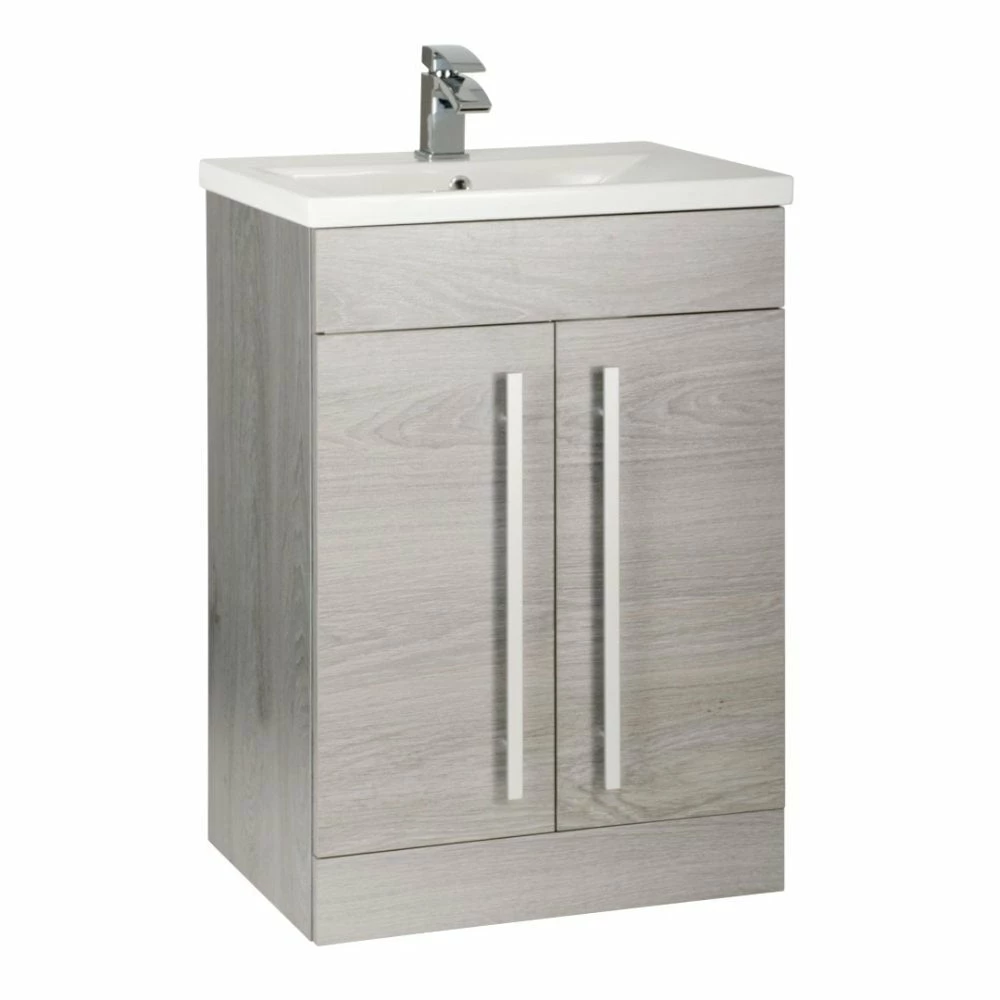 Upgrade your bathroom with the sleek and sophisticated Purity 600mm Floor Standing Double Door Unit in Silver Oak & 1-tap-hole, Mid-Depth Ceramic Basin. This modern set by Kartell features squared edges for a sharp look, smooth brushed aluminium handles, and exceptional durability. The soft-close door mechanism and ample storage space make it perfect for busy families and paired with it’s compatible 1-tap-hole ceramic basin, it effortlessly combines style and functionality at unbeatable value. Impress your guests with this modern addition to your bathroom!