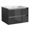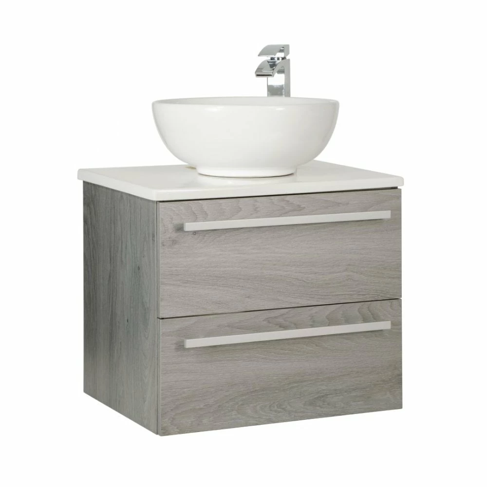Upgrade your bathroom with the sleek and sophisticated Purity 600mm Wall Mounted Double Drawer Unit in Silver Oak with a Ceramic Worktop & Ceramic Sit On Bowl Basin. This modern set by Kartell features squared edges for a sharp look, smooth brushed aluminium handles, and exceptional durability. The soft-close drawer mechanism and ample storage space make it perfect for busy families and paired with stylish large bowl shaped basin and ceramic worktop, it perfectly combines style and functionality at unbeatable value. Impress your guests with this modern addition to your bathroom!