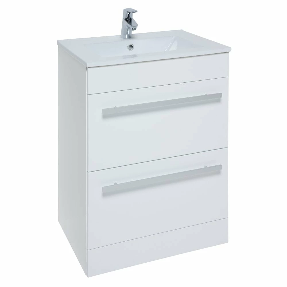 Upgrade your bathroom with the sleek and sophisticated Purity 600mm Floor Standing Double Drawer Unit in White Gloss & 1-tap-hole Ceramic Basin. This modern set by Kartell features squared edges for a sharp look, smooth brushed aluminium handles, and exceptional durability. The soft-close drawer mechanism and ample storage space make it perfect for busy families and paired with it’s compatible 1-tap-hole ceramic basin, it effortlessly combines style and functionality at unbeatable value. Impress your guests with this modern addition to your bathroom!