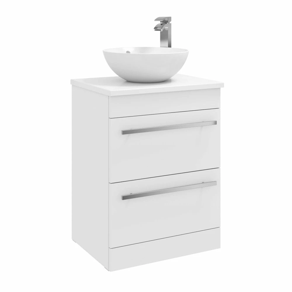 Upgrade your bathroom with the sleek and sophisticated Purity 600mm Floor Standing Double Drawer Unit in White Gloss with a Ceramic Worktop & Ceramic Sit On Bowl Basin. This modern set by Kartell features squared edges for a sharp look, smooth brushed aluminium handles, and exceptional durability. The soft-close drawer mechanism and ample storage space make it perfect for busy families and paired with stylish large bowl shaped basin and ceramic worktop, it perfectly combines style and functionality at unbeatable value. Impress your guests with this modern addition to your bathroom!