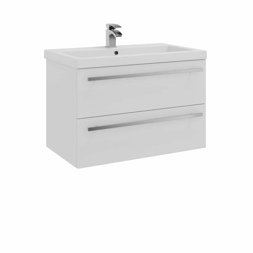 Upgrade your bathroom with the sleek and sophisticated Purity 800mm Wall Mounted Double Drawer Unit in White Gloss & 1-tap-hole, Mid-Depth Ceramic Basin. This modern set by Kartell features squared edges for a sharp look, smooth brushed aluminium handles, and exceptional durability. The soft-close door mechanism and ample storage space make it perfect for busy families and paired with it’s compatible 1-tap-hole ceramic basin, it effortlessly combines style and functionality at unbeatable value. Impress your guests with this modern addition to your bathroom!